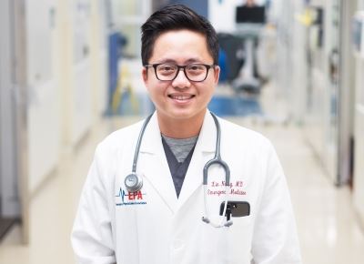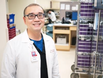 Pictured is Peter Liang, PharmD, clinical pharmacist, part of the stroke team alerted when the Code Neuro was originally called. A clinical pharmacist, along with physicians and nurses, helps assess a patient’s eligibility for the tPA therapy, which includes reviewing the patient’s medication history for drug interactions and any bleeding risks, depending on type of stroke. After team assessment, Peter facilitated the timely preparation and delivery of the medication to the patient for administration––time is of the essence in the treatment of a stroke.