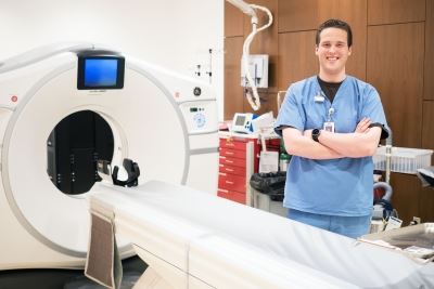 Ian Kelly, radiologic technologist, is pictured with one of the Hospital’s CT (computerized tomography) scanners. “Our department’s role was to manage the CT imaging of the patient’s brain, and to get this imaging accomplished as quickly as possible and in close collaboration with the care team.”