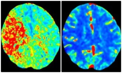 Next up in the fast-moving chain of events was more advanced brain imaging to determine if surgery was required: a CT angiogram and CT perfusion. This color-coded perfusion scan showed the area of Julie’s brain that was inadequately supplied (or perfused) with blood—the red area pictured left. A different but essential view showed that same large area of brain tissue has normal blue color (right). This meant that the red, injured area of her brain could be saved from permanent damage if its blocked blood flow could be emergently restored.