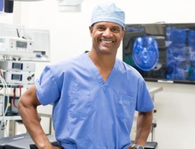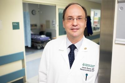 Neurosurgeon Jeffrey Thomas, MD: “Within two hours of Julie arriving at the ED at 9:24 a.m., she was in surgery and on the cath lab table,” he recalled. “Since imaging showed that two large arteries in her brain were blocked, surgery was absolutely required. The location was crucial, and she was going downhill. The initial symptoms were becoming more serious, signaling a larger stroke that was now likely to result in death.”